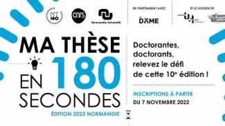 Normandie Université et le CNRS Normandie lancent leur dixième édition du concours “Ma thèse en 180 secondes”. Le but ? Proposer aux doctorants du territoire de faire connaître leurs travaux de recherche au grand public en trois minutes et avec l'appui d'une seule diapositive, de manière claire, concise et néanmoins convaincante. L’édition 2023 s'organise en partenariat avec Le Dôme et le soutien de l’université Le Havre Normandie et de Science action. La finale normande aura lieu en mars 2023 au Havre et les lauréats représenteront la Normandie à la demi-finale nationale prévue en avril à Paris.
